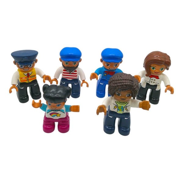Das Set enthält 6 verschiedene DUPLO Figuren: ein Mechaniker im blauen Overall, eine Bäckerin mit weißer Weste, ein Seemann mit Bart und Mütze, ein Zugführer mit Warnweste, ein Mädchen mit Regenbogen-Shirt sowie eine junge Frau mit Umwelt-Design auf dem Shirt.