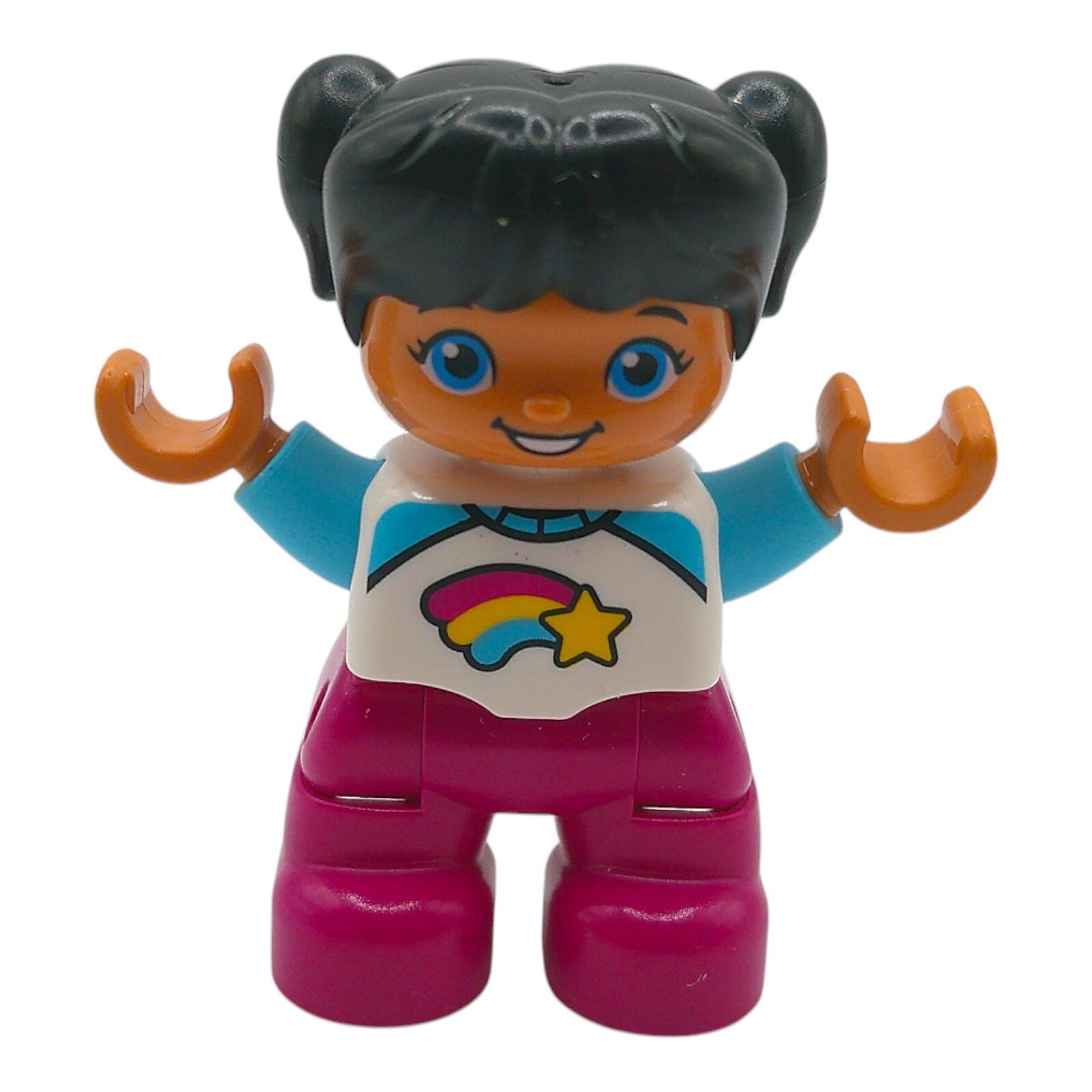 Mädchen mit rosa Hose, schwarzen Haaren und einem weiß-blauen Shirt mit Stern und Regenbogenschweif