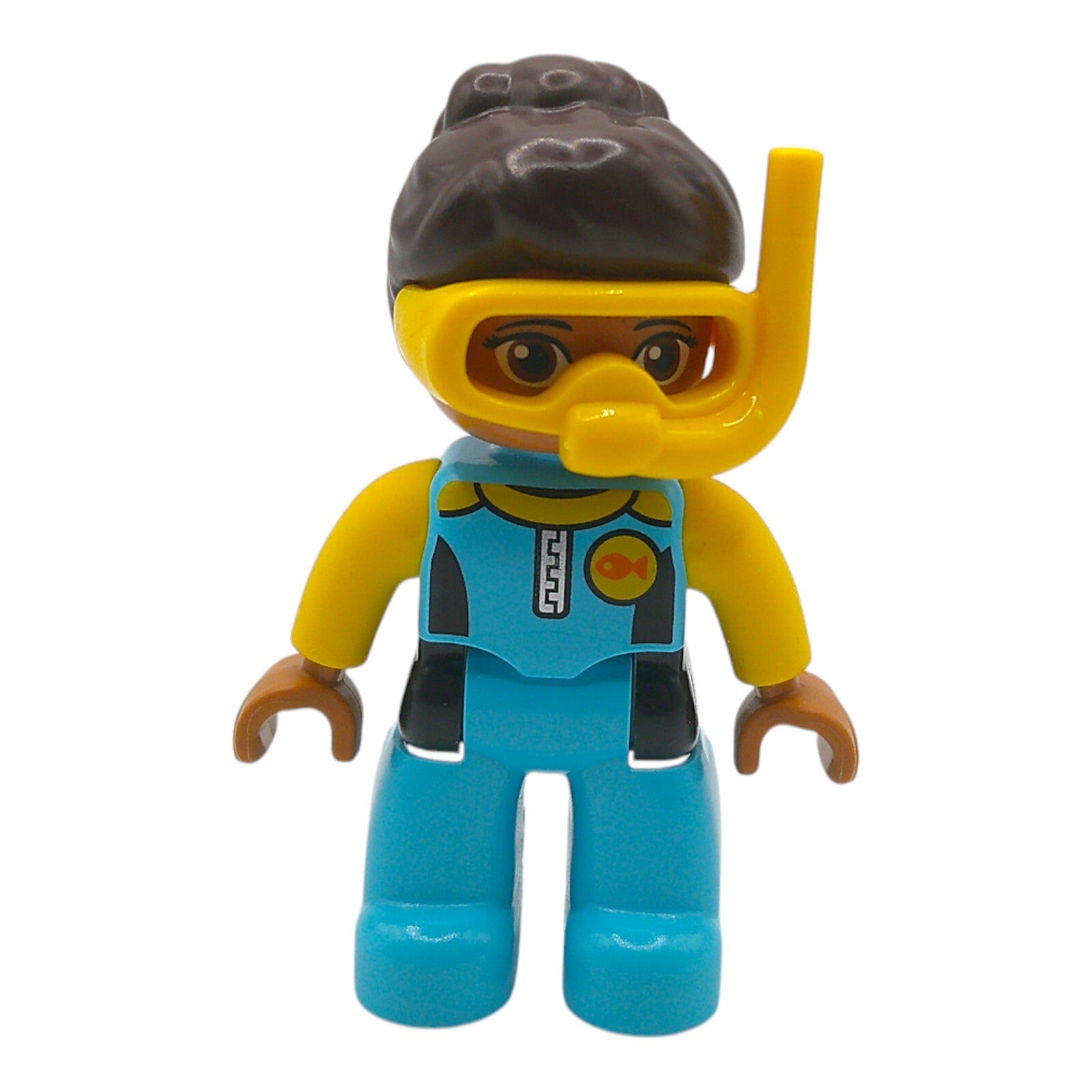 Taucherin in blauem Tauchanzug mit gelber Taucherbrille und Schnorchel