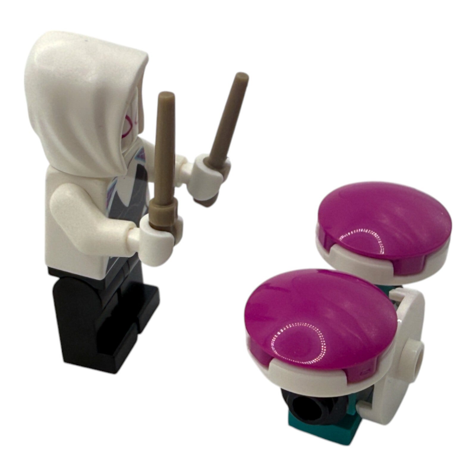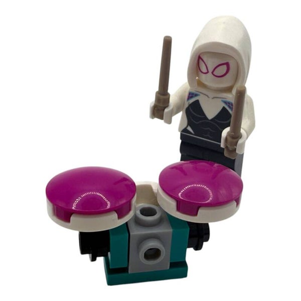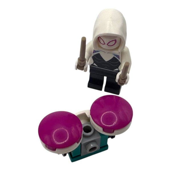 LEGO® Marvel™ Minifigur Ghost Spider mit Schlagzeug und Drumsticks – Rockt jede Sammlung!