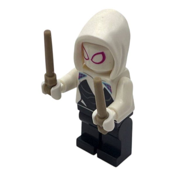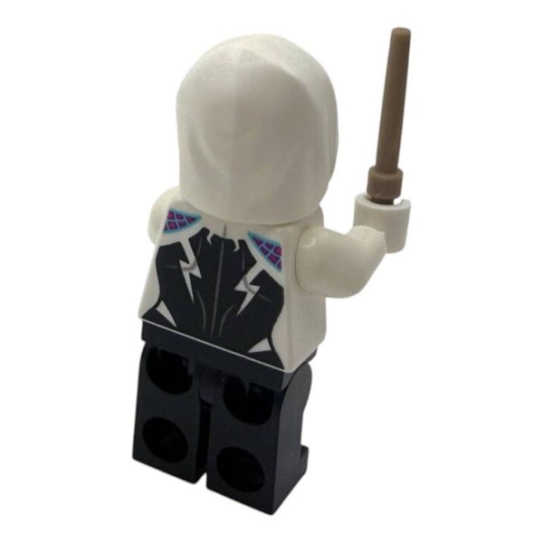 Die Ghost Spider Minifigur begeistert mit einem aufwendig bedruckten weißen Oberteil, schwarzen Beinen und ihrer charakteristischen Kapuze. Pinke Details an den Augen sorgen für einen zusätzlichen Farbakzent.