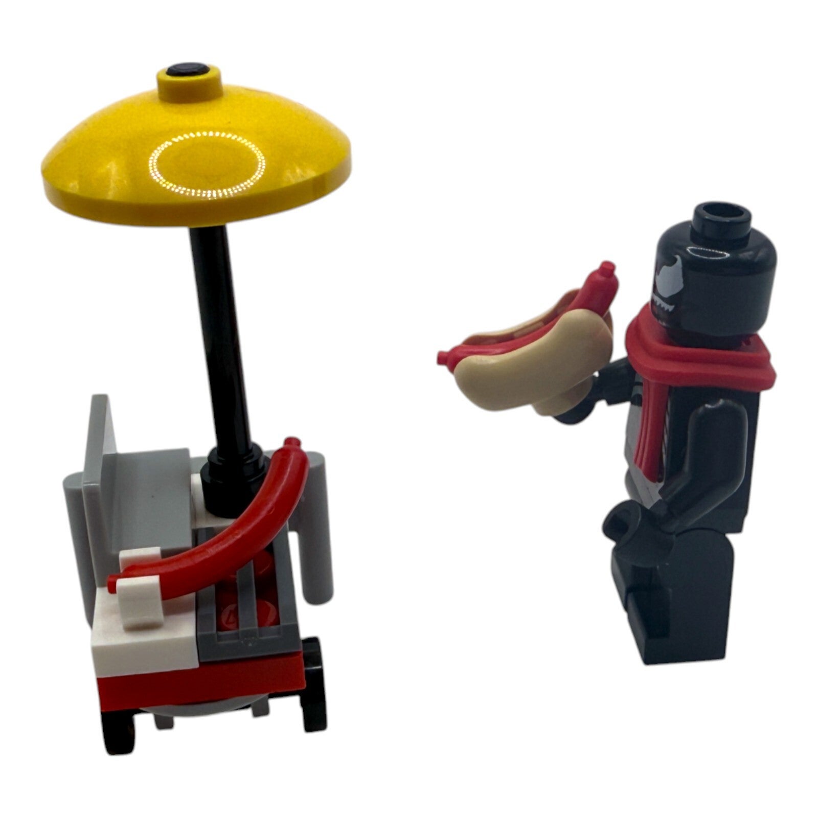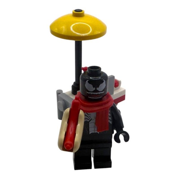Mit der einzigartigen LEGO® Marvel™ Venom Minifigur samt Hotdog und Hotdogstand aus dem Adventskalender 76293 bringst du eine Extraportion Humor in deine Sammlung. Venom zeigt sich hier in seinem klassischen schwarzen Anzug mit weißem Spinnensymbol und hält stilecht einen Hotdog in der Hand. Der detailreiche Hotdogstand inklusive Grill, gelbem Sonnenschirm und rollbarem Unterbau rundet das Set perfekt ab.