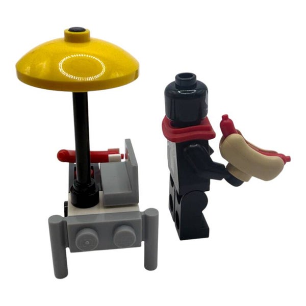 Der mobile Hotdogstand ist mit einem gelben Sonnenschirm, einem Würstchen auf dem Grill und Rädern ausgestattet – ideal für fantasievolle Abenteuer in deiner LEGO® Stadt.
