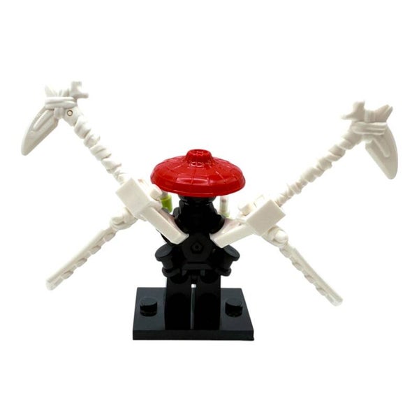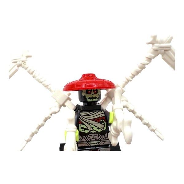 Die Minifigur ist mit einem Knochen-Shuriken sowie zwei Knochen-Schwertern ausgestattet, die an seinem Rücken befestigt sind und wie Flügel wirken. Zusätzlich trägt er zwei große Wurfsterne aus Knochenmaterial – perfekt für düstere Ninjago-Missionen.