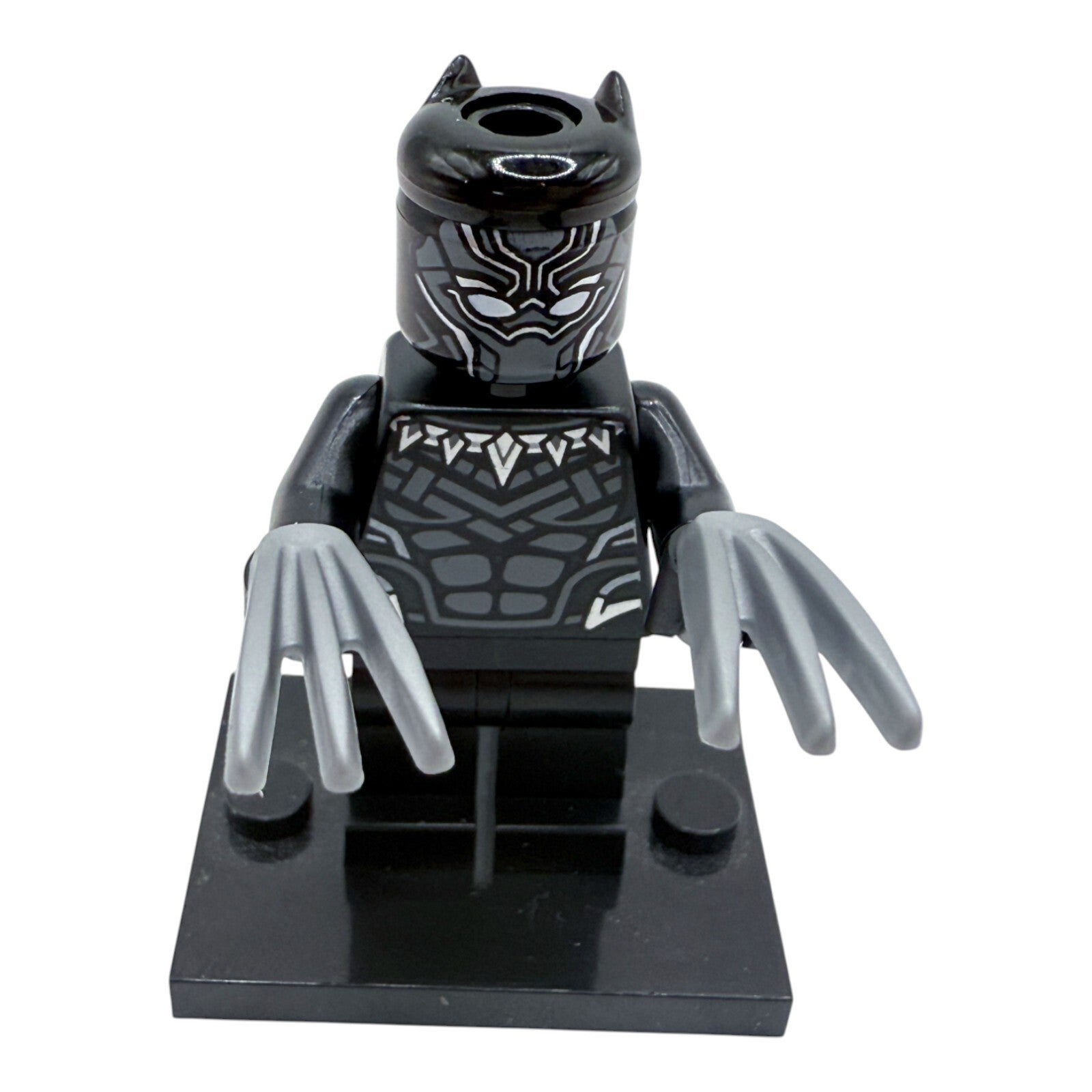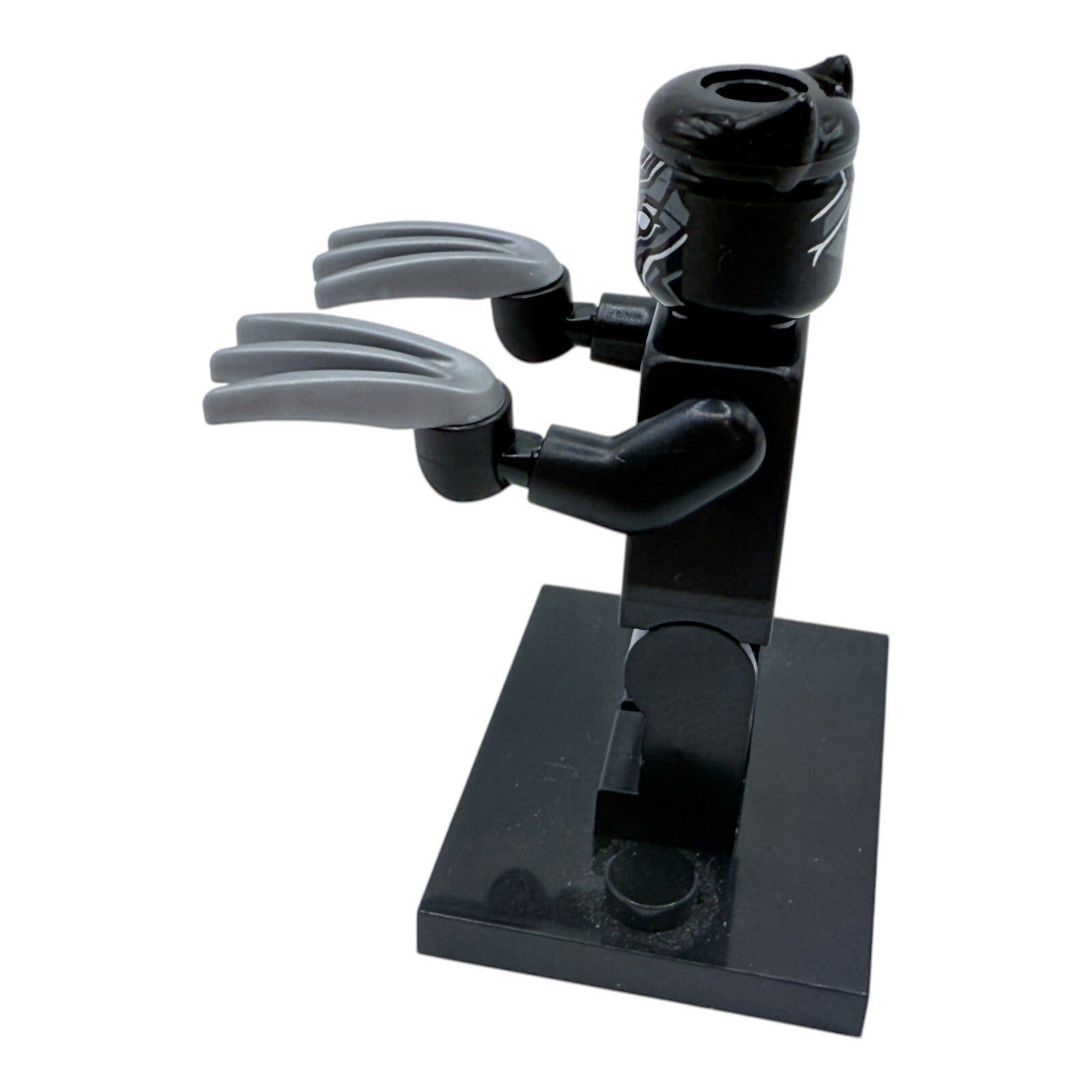 Black Panther trägt seine charakteristische Panther-Maske mit Ohren. In den Händen hält er zwei silberne Klauen, bereit für den Nahkampf – ein Muss für jede Superhelden-Szene im LEGO® Universum.