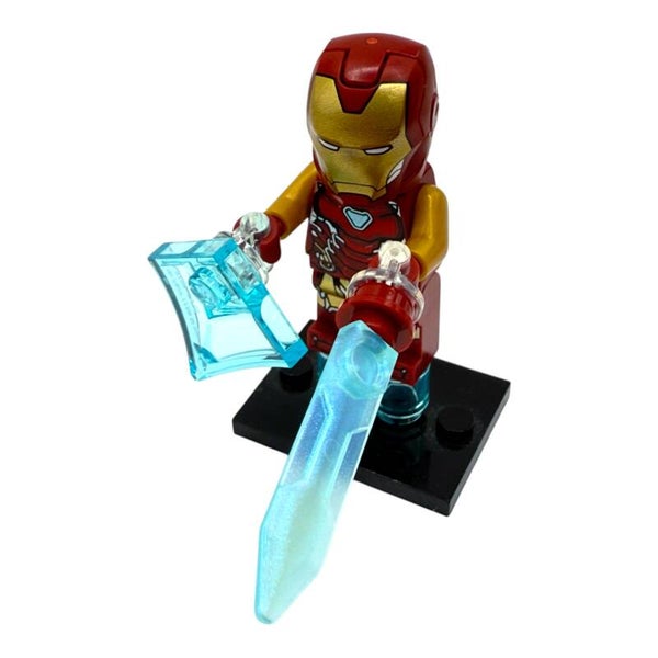 Iron Man ist mit einem hellblauen, transparenten Schwert und Schild ausgestattet, die im futuristischen Kristall-Stil gefertigt sind. Beide Elemente machen ihn zu einem echten Highlight in jeder Sammlung oder Spielszene.