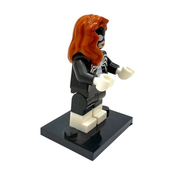 Julia Carpenter trägt ihren bekannten schwarzen Anzug, verziert mit einer großen weißen Spinne auf der Vorderseite. Weiß bedruckte Schuhe und große weiße Augen auf der Maske unterstreichen ihr markantes Erscheinungsbild. Die rötlich-braune Frisur rundet das Design ab und verleiht ihr eine dynamische Ausstrahlung.