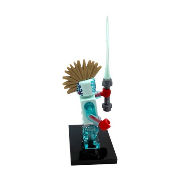 Diese LEGO® Ninjago™ Minifigur zeigt sich von ihrer schaurig-schönen Seite: Der Geisterdrachenmensch aus dem Set 30700 „Arins Duell mit dem Drachenmenschen“ ist eine exklusive Erscheinung mit besonders auffälligen hellblau transparenten Gliedmaßen und einem aufwendig bedruckten Körper. Seine blonde Irokesenfrisur, die grimmige Mimik mit roten Augen und scharfen Zähnen, machen ihn zum perfekten Gegner für die tapferen Ninja.