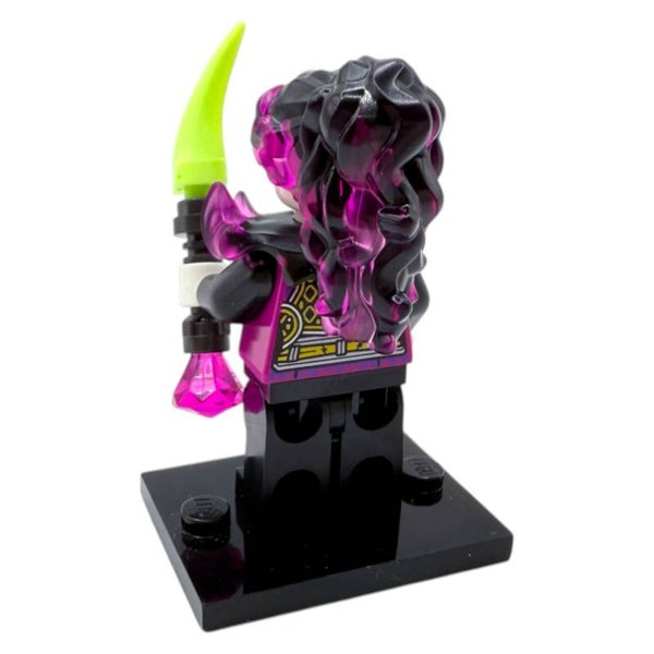 Ihre Waffe ist ein imposantes Fantasy-Schwert mit einer transparent-grünen Klinge und einem magentafarbenen Diamanten am Griff – passend zu ihrem Albtraum-Stil. Die Figur eignet sich ideal für Dreamzzz-MOCs, dunkle Dioramen, Rollenspiele und als Sammlerstück.