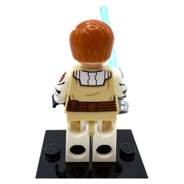 Obi-Wan trägt eine aufwendig bedruckte hellbeige Jedi-Robe, passend zur Clone-Wars-Ära. Besonders auffällig ist das weinrote Emblem der Neuen Republik auf seinem linken Arm – ein schönes Detail für Fans. Kopf und Frisur zeigen ihn mit roten Haaren und Bart, inklusive entschlossenem Gesichtsausdruck.