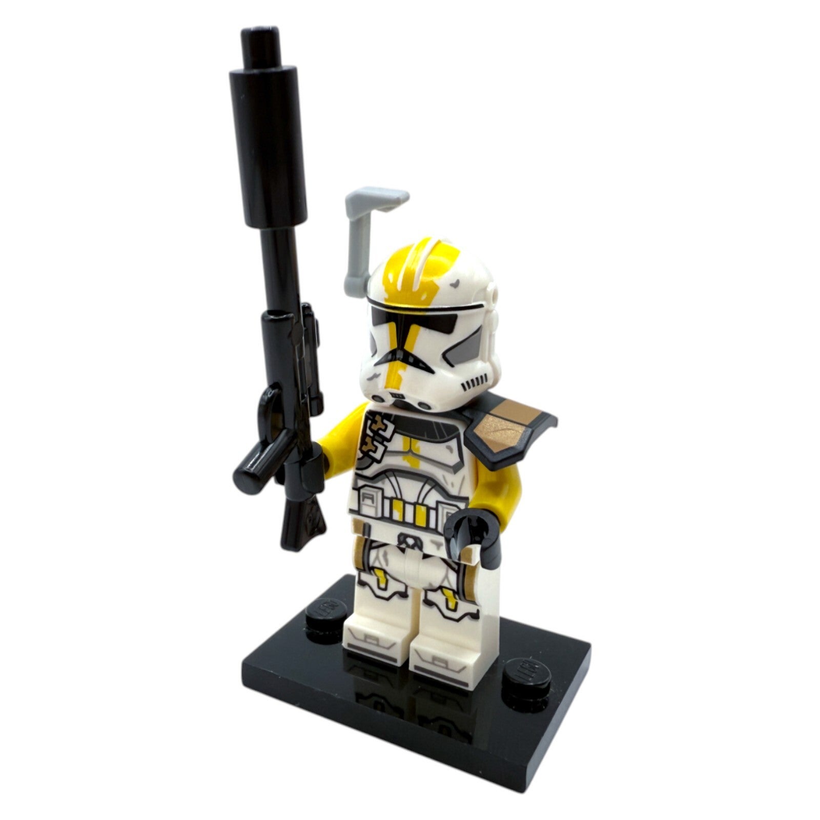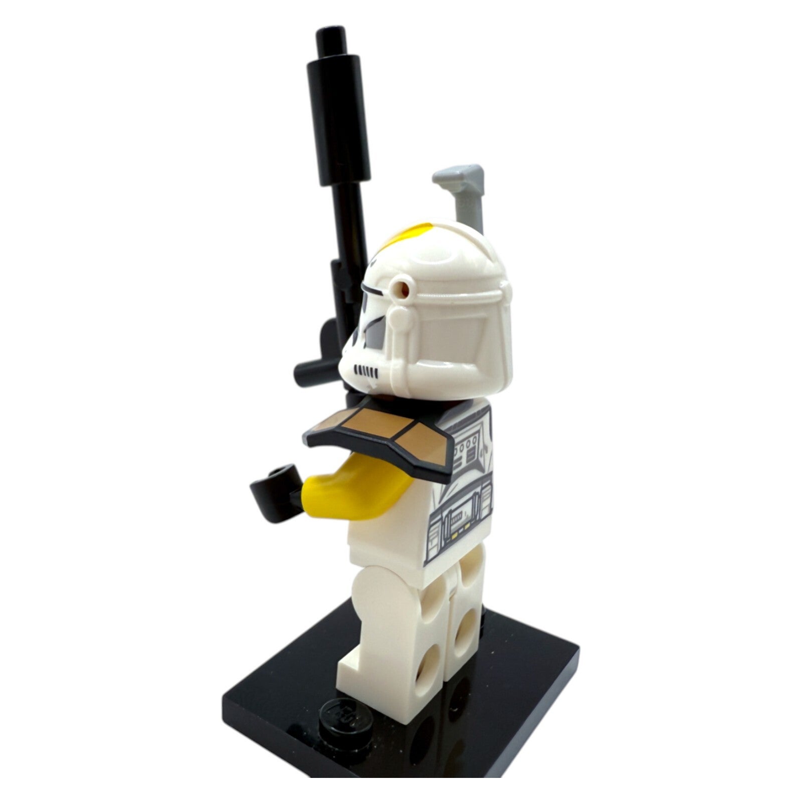 Diese Minifigur trägt den klassischen weißen Stormtrooper-Anzug mit auffälligen gelben Designelementen, wie sie für die 327. Sternenkorps charakteristisch sind. Ein besonderes Detail ist die Schulterpolsterung, die auf einer Seite angebracht ist und die Figur noch realistischer wirken lässt. Dazu gibt es einen langen Blaster mit Schalldämpfer – perfekt für actionreiche Szenen oder Display-Sammlungen.