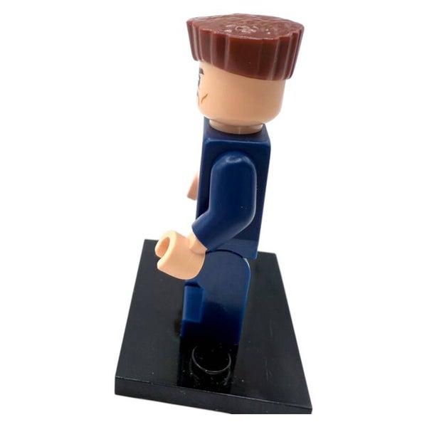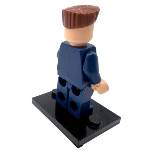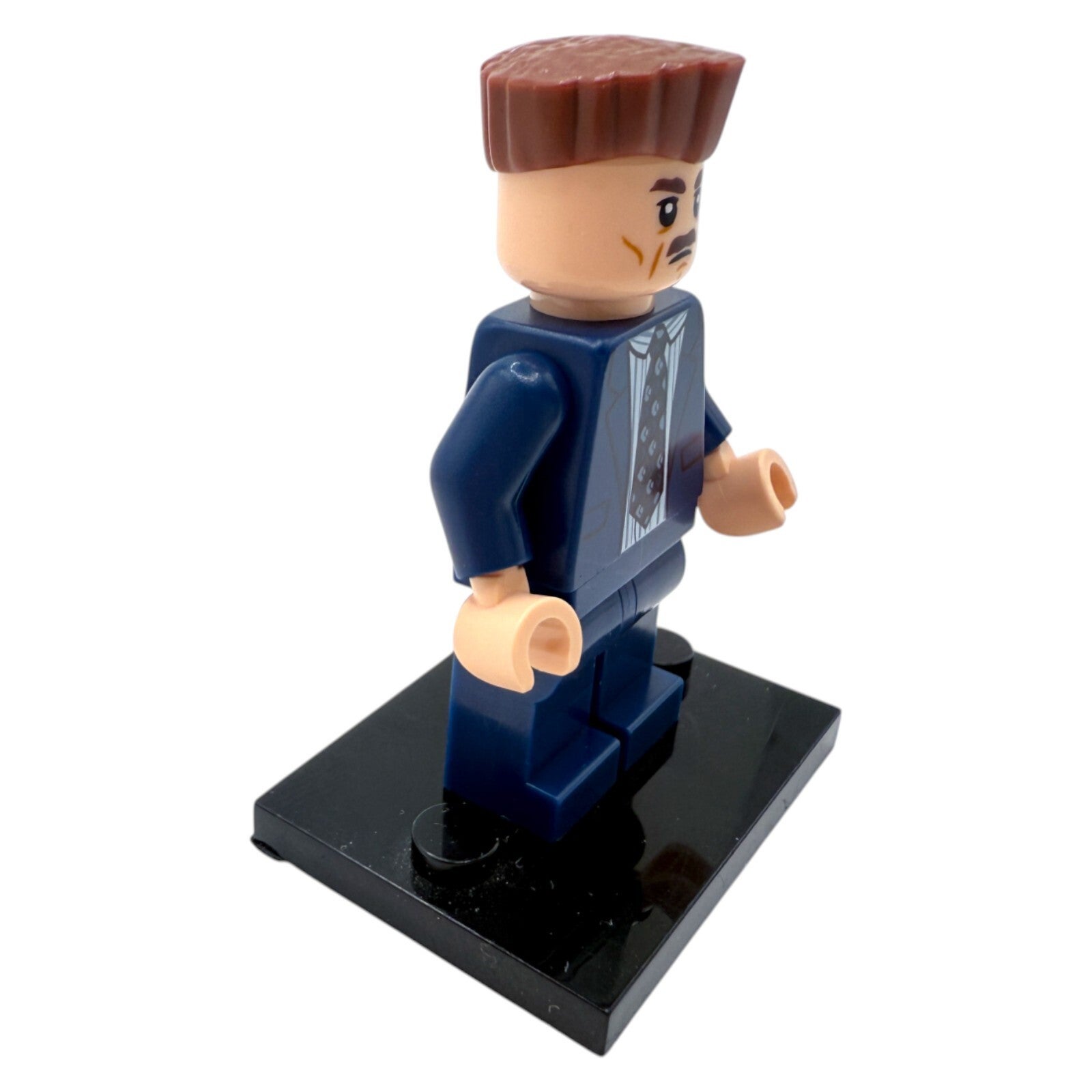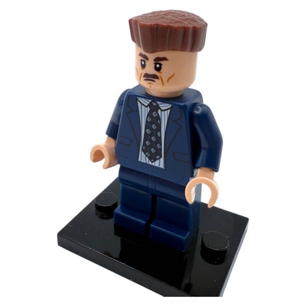 Die Figur trägt einen blauen Anzug mit gestreiftem Hemd und Krawatte – ein Outfit, das perfekt zu seiner strengen und markanten Persönlichkeit passt. Die makellos sitzende Frisur ist ein weiteres charakteristisches Merkmal und wurde von LEGO® detailgetreu umgesetzt.