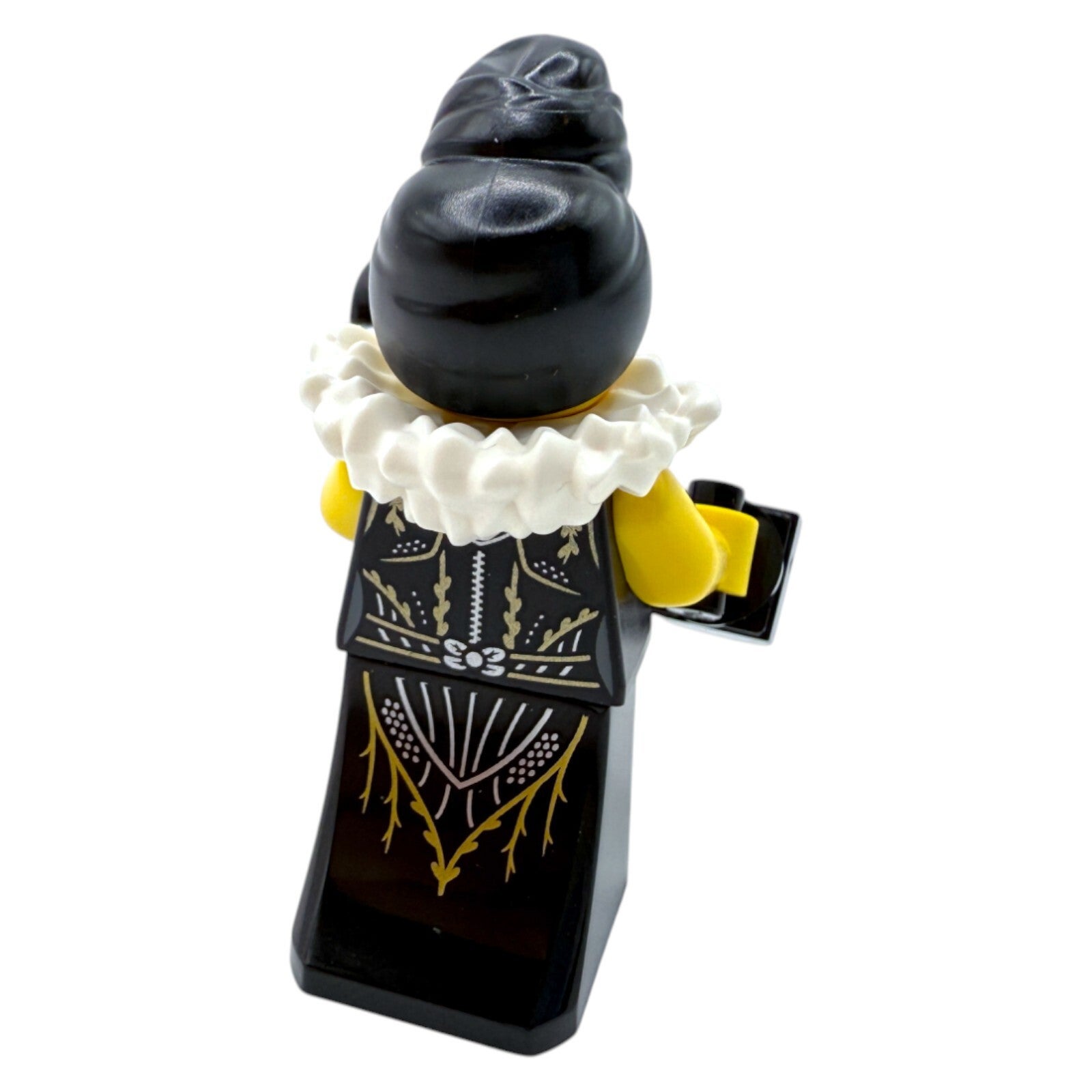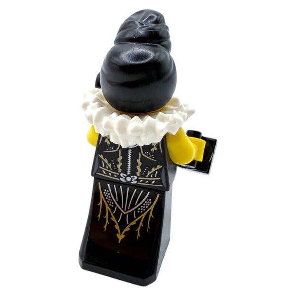Diese LEGO® MOC Minifigur „Gräfin aus dem Orient-Express“ verkörpert den Glamour der 1920er und 1930er Jahre. Sie trägt ein schwarzes Kleid mit aufwendigen goldenen und weißen Ornamenten, kombiniert mit einem weißen Pelzkragen.