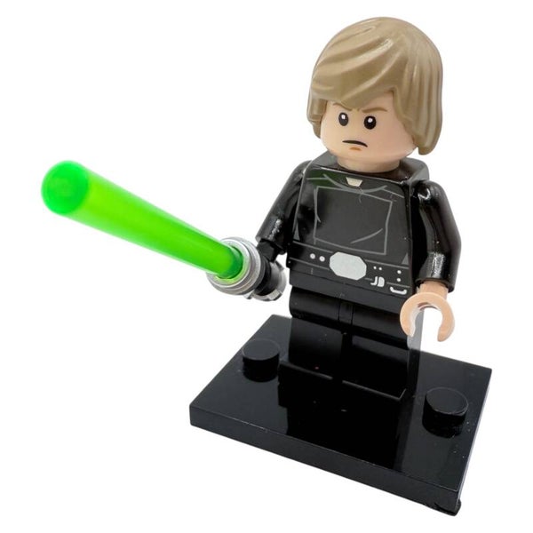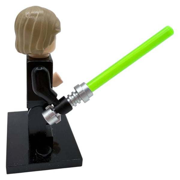 Luke trägt einen komplett schwarzen Jedi-Anzug mit fein gedruckten Details wie Falten, Gürtel und Kragen. In der Hand hält er sein charakteristisches grünes Lichtschwert – Symbol seines endgültigen Aufstiegs zum Jedi. Die Figur verfügt über ein beidseitig bedrucktes Gesicht, das unterschiedliche Emotionen zeigt, passend zu spannenden Kampfszenen gegen Darth Vader oder Palpatine.
