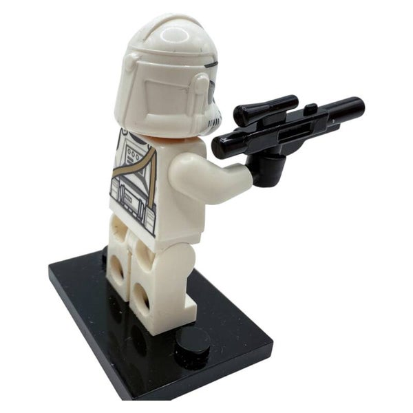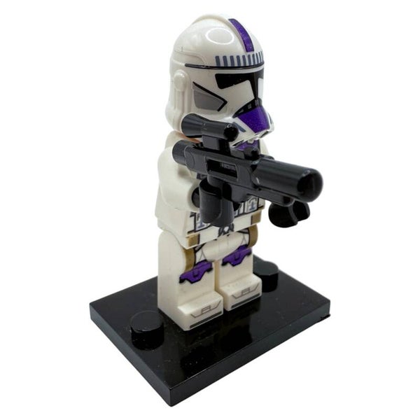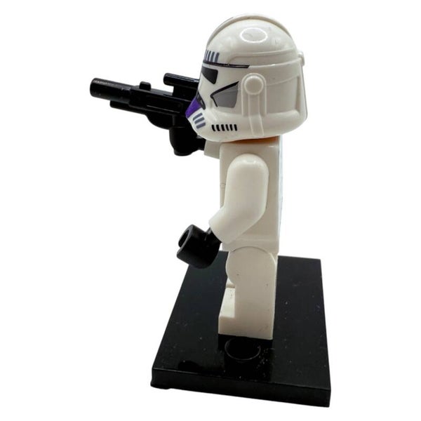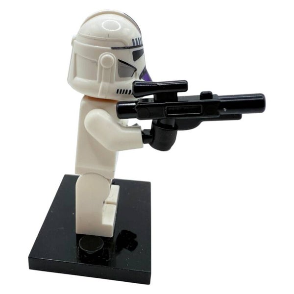Die Figur trägt eine weiße Klonrüstung mit lilafarbenen Abzeichen, die Helm und Torso bedecken. Der präzise Druck auf Vorder- und Rückseite sorgt für realistische Details, während der kurze Blaster die Einsatzbereitschaft des Troopers unterstreicht. Diese Figur ist ein Highlight für jede Klonarmee.