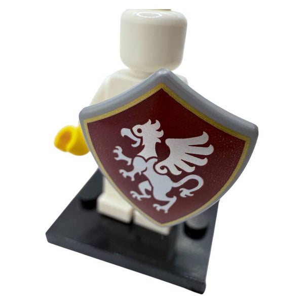 Das Schild zeigt einen silbernen Greif auf rotbraunem Hintergrund, umrahmt von einem silberfarbenen Rand. Der präzise Druck hebt sich klar ab und spiegelt den typischen Stil der LEGO® Ritterfraktionen wider. Dieses Accessoire passt ideal zu Rittern, Wächtern oder Königswachen.