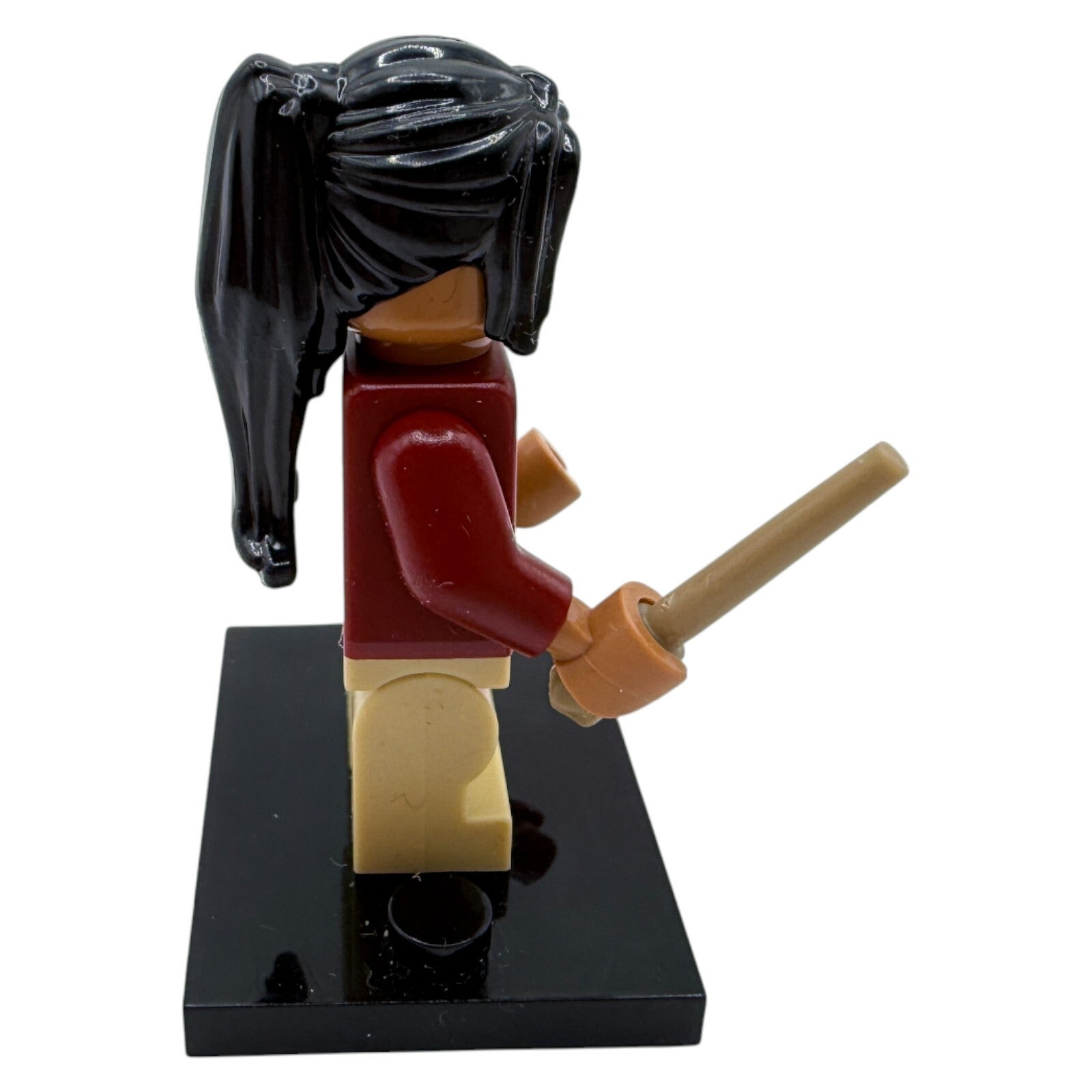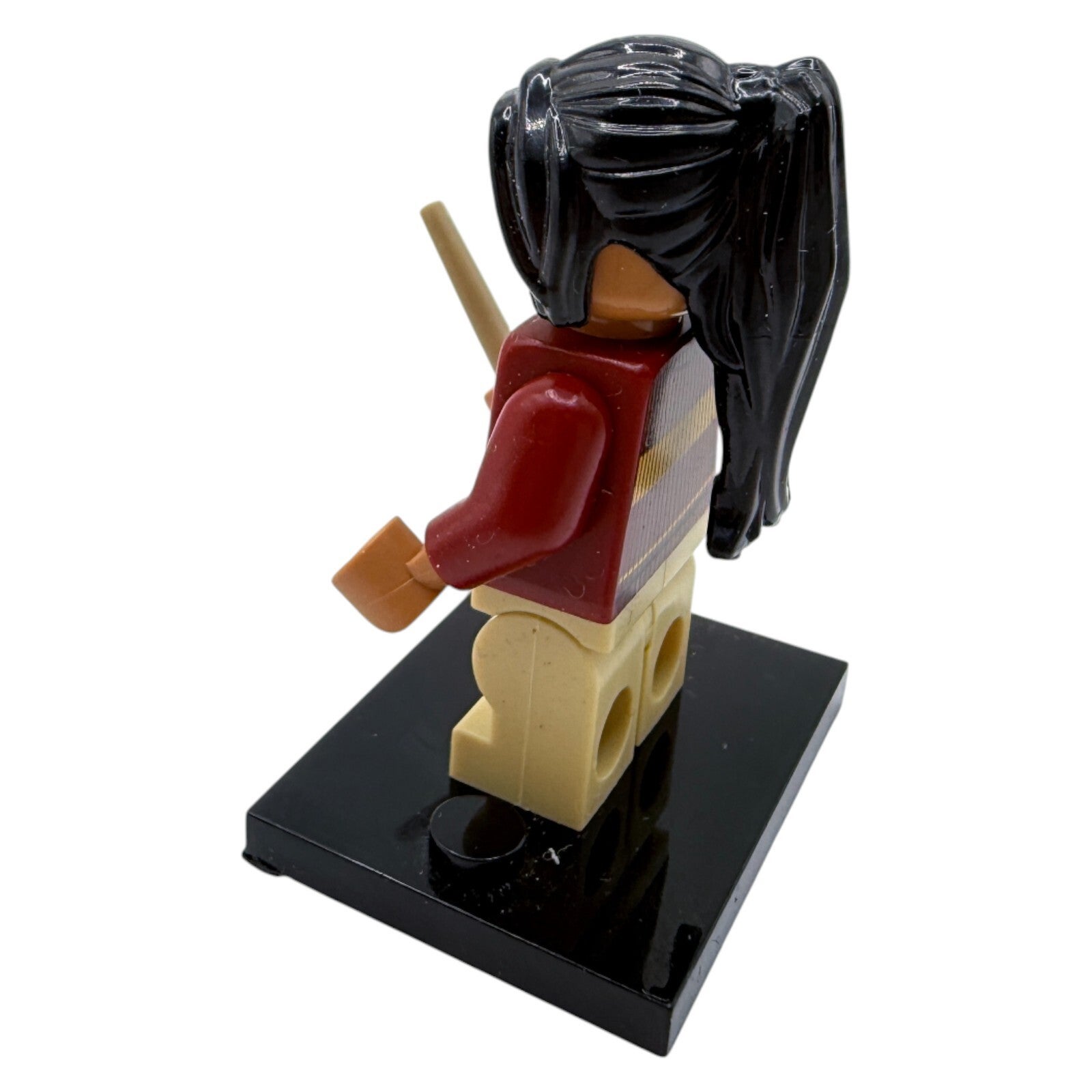Die Figur trägt eine beige Hose und einen rot-gelben Strickpullover, passend zu den Gryffindor-Farben. Mit ihren langen schwarzen Haaren und dem Zauberstab ist Alicia Spinnet sofort als Hogwarts-Schülerin und Quidditch-Spielerin erkennbar.