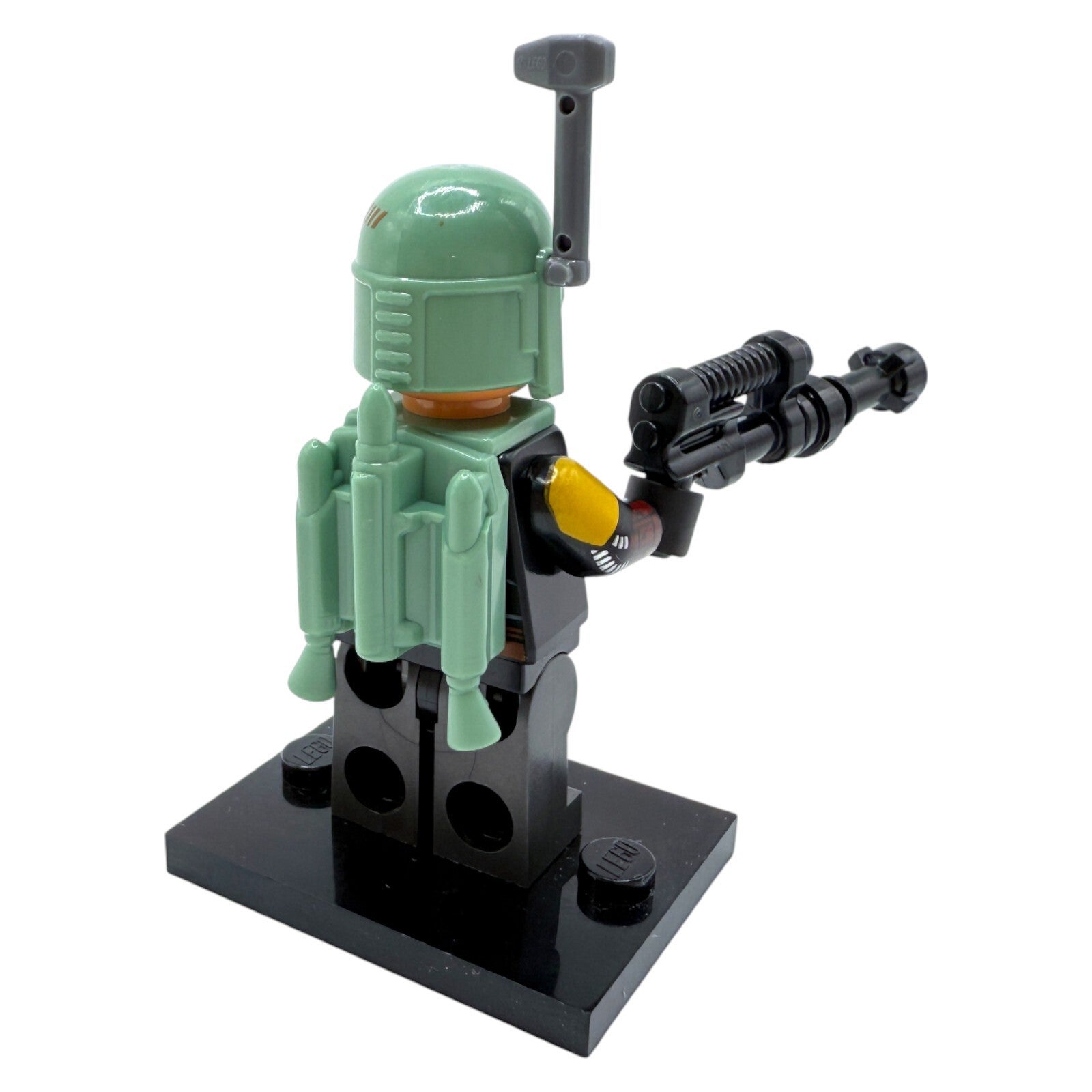 Die Figur trägt einen langen schwarzen Blaster, das typische grüne Mandalorianer-Helm-Design, ein farblich abgestimmtes Jetpack sowie detaillierte Arm- und Beinbedruckungen.