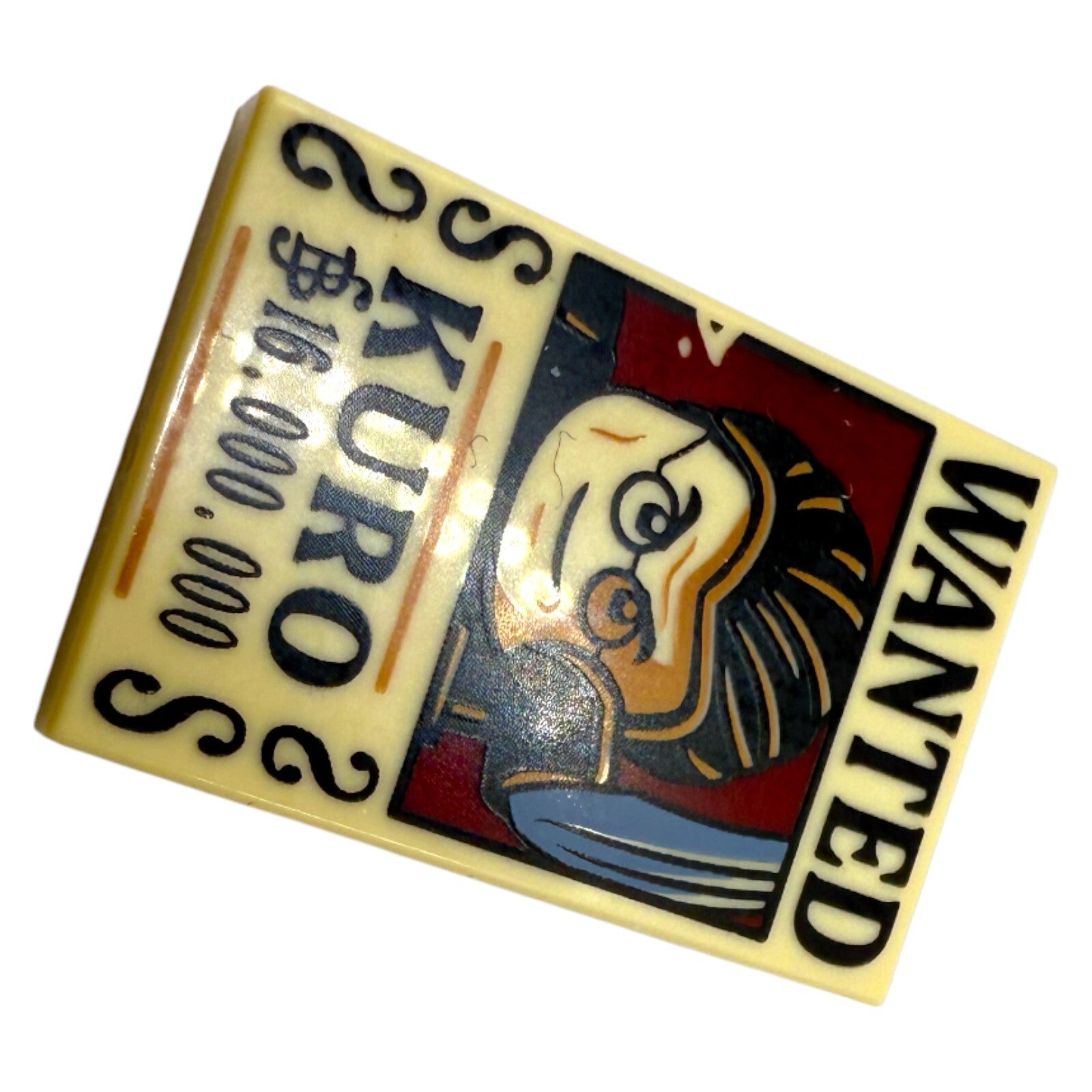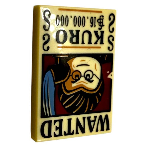 Diese seltene LEGO® Fliese zeigt das „Wanted“-Motiv des Charakters Kuro aus der beliebten Netflix One Piece Serie. Die 2x3 Fliese ist original von LEGO und wurde direkt bedruckt – kein Aufkleber!