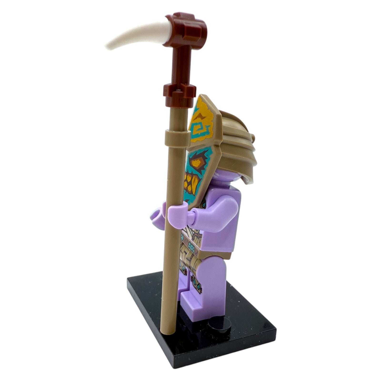Die Figur überzeugt durch ein aufwendig bedrucktes Insel-Outfit in Violett- und Sandtönen, eine markante zeremonielle Maske sowie den charakteristischen Stab mit Stoßzahn-Aufsatz, der den spirituellen Status des Wächters unterstreicht. Ein eindrucksvoller Charakter für Displays und Dioramen.