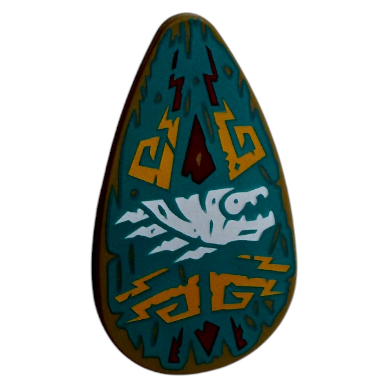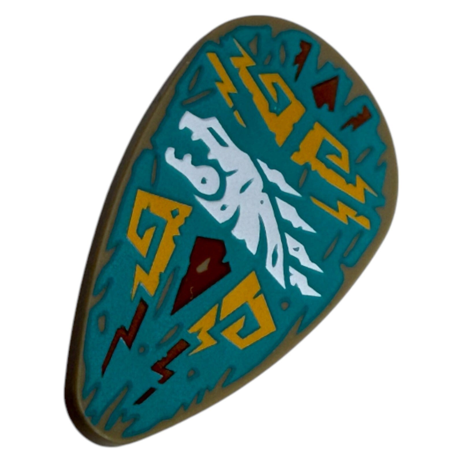 Das Design zeigt typische Insel- und Donner-Symbole der Ninjago-Storyline mit kräftigen Türkis-, Gelb- und Weißtönen. Durch die ovale Form eignet sich das Schild ideal für Minifiguren der Wächter, für Ersatz, Sammlerzwecke oder kreative MOC-Bauprojekte.