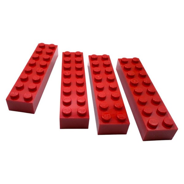 Zum Verkauf stehen 4 originale LEGO® Steine im Format 2x8 in der Farbe Bright Red (Rot).
