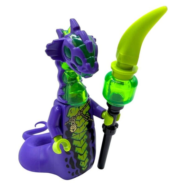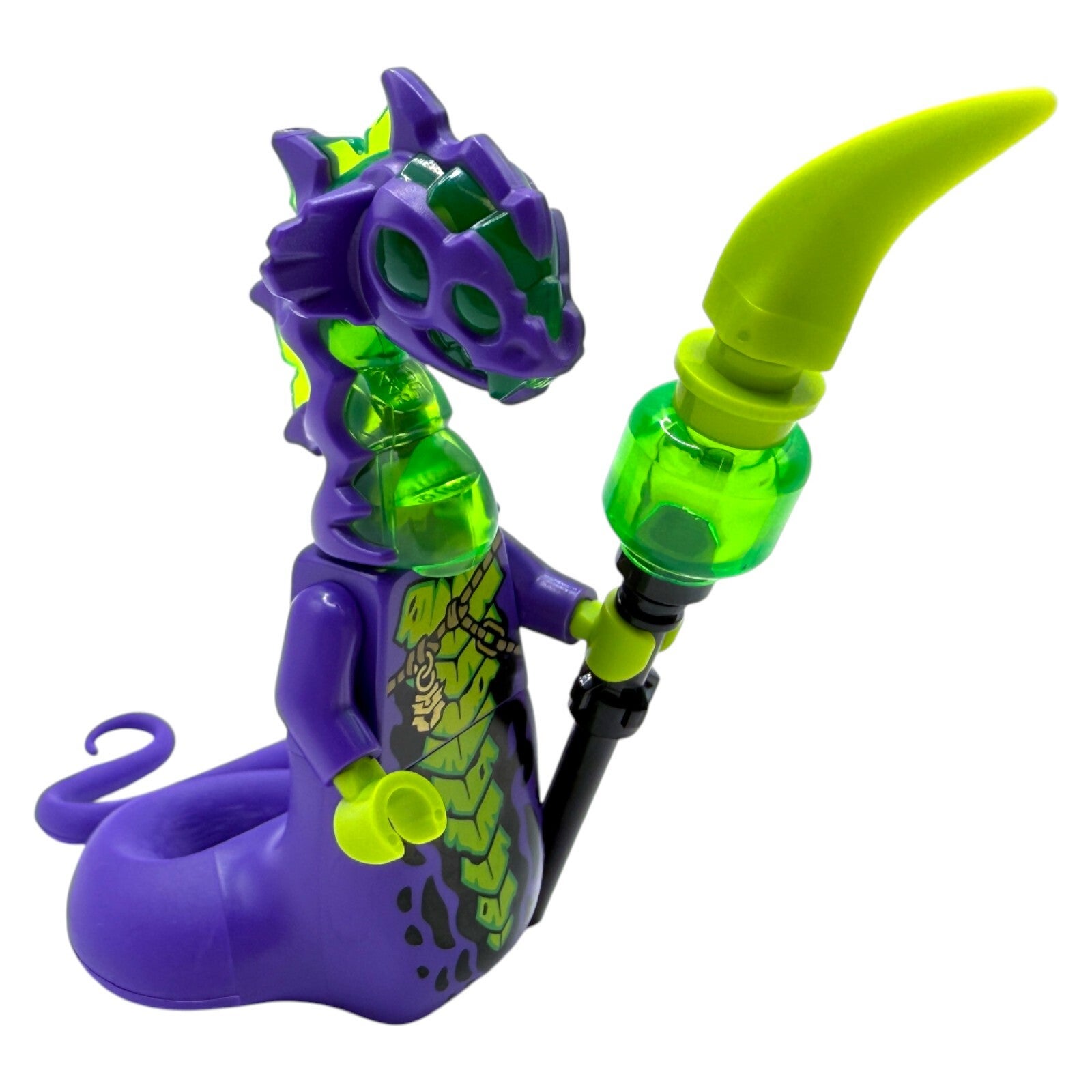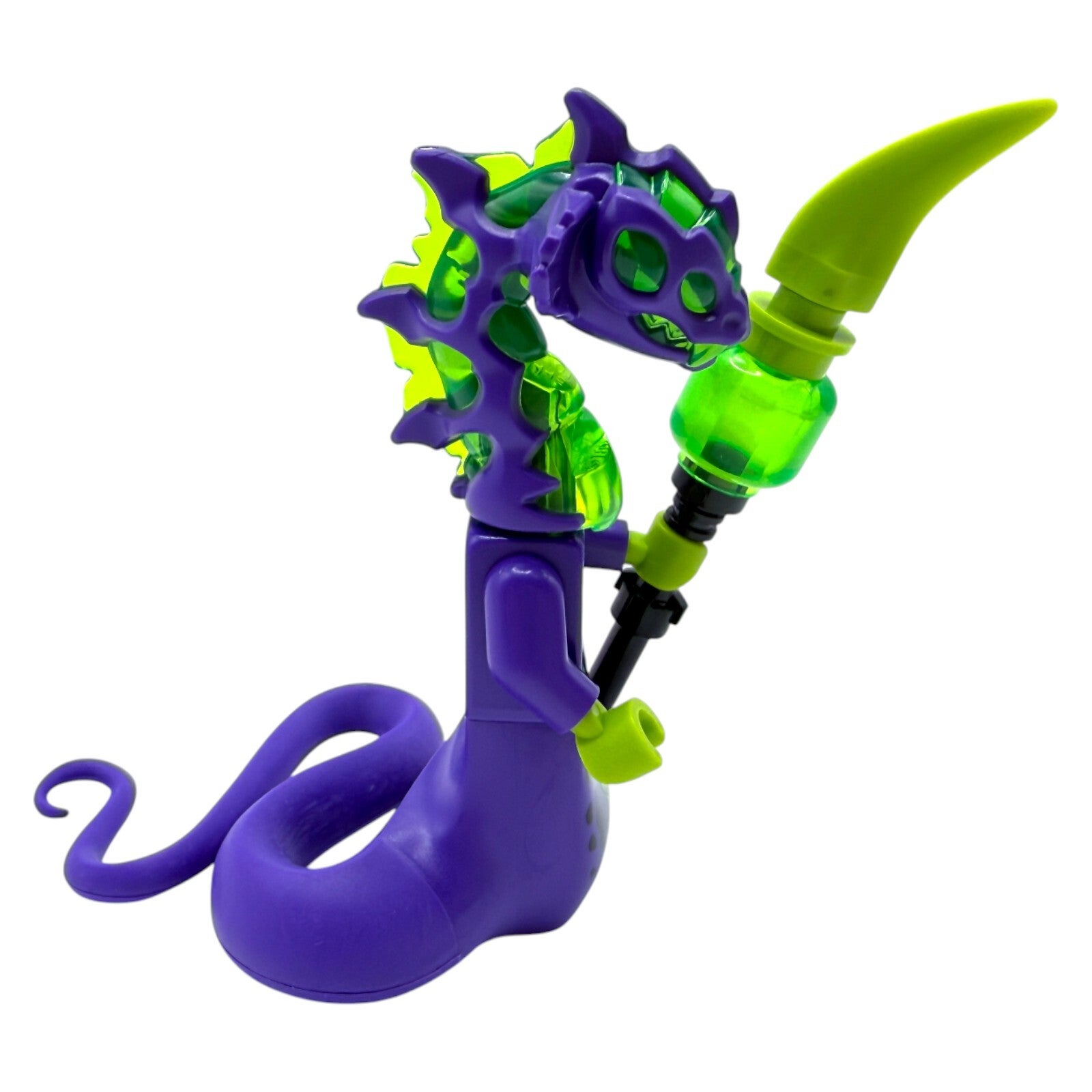 Das Säuremonster überzeugt durch sein schlangenartiges Unterteil in kräftigem Violett sowie einen transluzent-grünen Oberkörper, der den giftigen, mystischen Look unterstreicht. Der detaillierte Drachenkopf mit durchscheinenden Elementen sorgt für eine besonders bedrohliche Optik und hebt sich deutlich von klassischen Minifiguren ab.