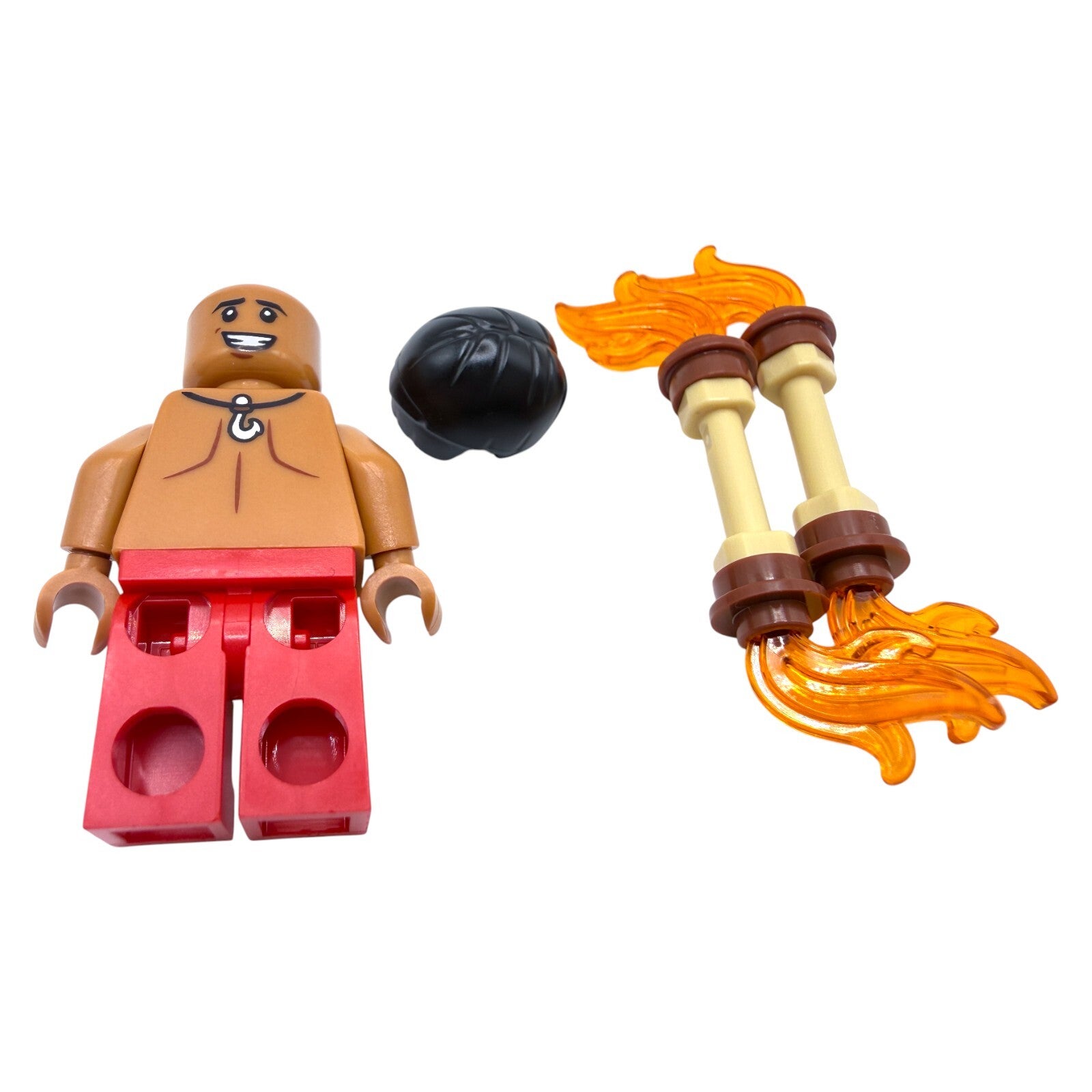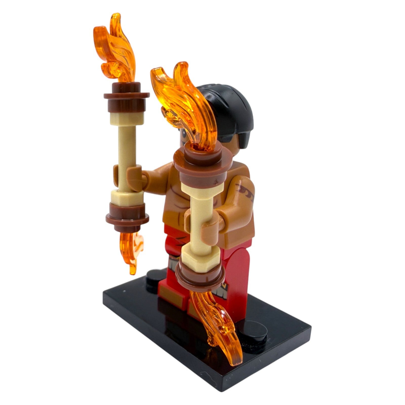 David trägt eine bedruckte, muskulöse Oberkörper-Grafik mit Halskette sowie rot gemusterte Shorts im Inselstil. Das schwarze Haarelement rundet den Look ab. Das Zubehör in Form von zwei Fackeln mit transparenten Flammen sorgt für eine dynamische Präsentation und hohe Spiel- oder Sammlerattraktivität.