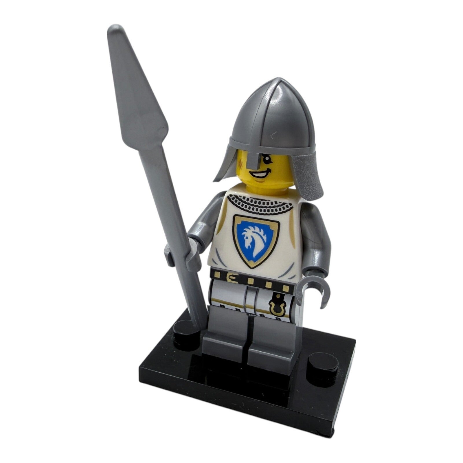Diese detailreiche LEGO® Castle Minifigur „Horse Knight Spearman“ stammt aus dem Set 31168 Ritterburg. Der Ritter gehört zur Pferde-Fraktion und trägt das markante Wappen mit weißem Pferdekopf auf blauem Schild.