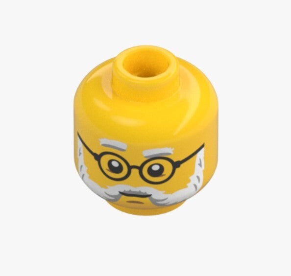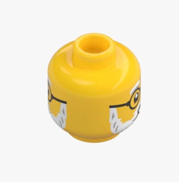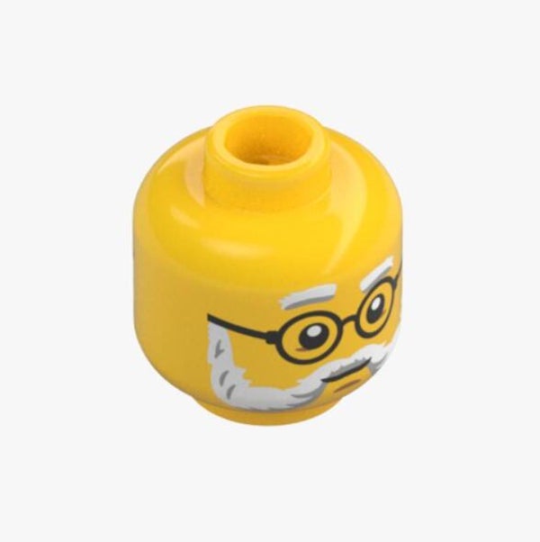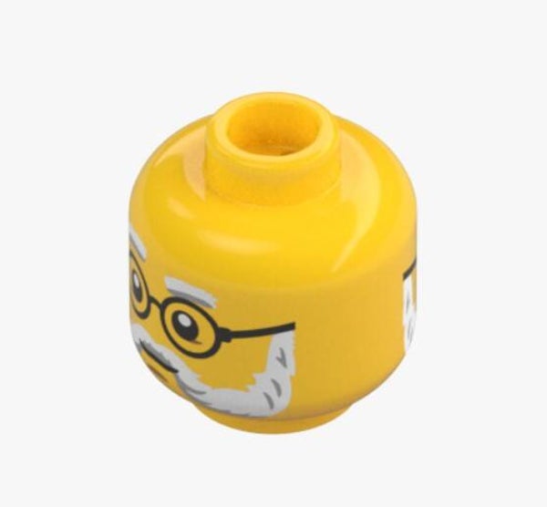 Zum Verkauf steht ein original LEGO® Minifiguren-Kopf in Bright Yellow, der durch seine detailreiche Bedruckung mit Brille, grauen Augenbrauen und Bart besonders hervorsticht. Dank der zwei unterschiedlichen Gesichtsausdrücke eignet sich dieser Kopf ideal für abwechslungsreiche Szenen und individuelle Figuren.